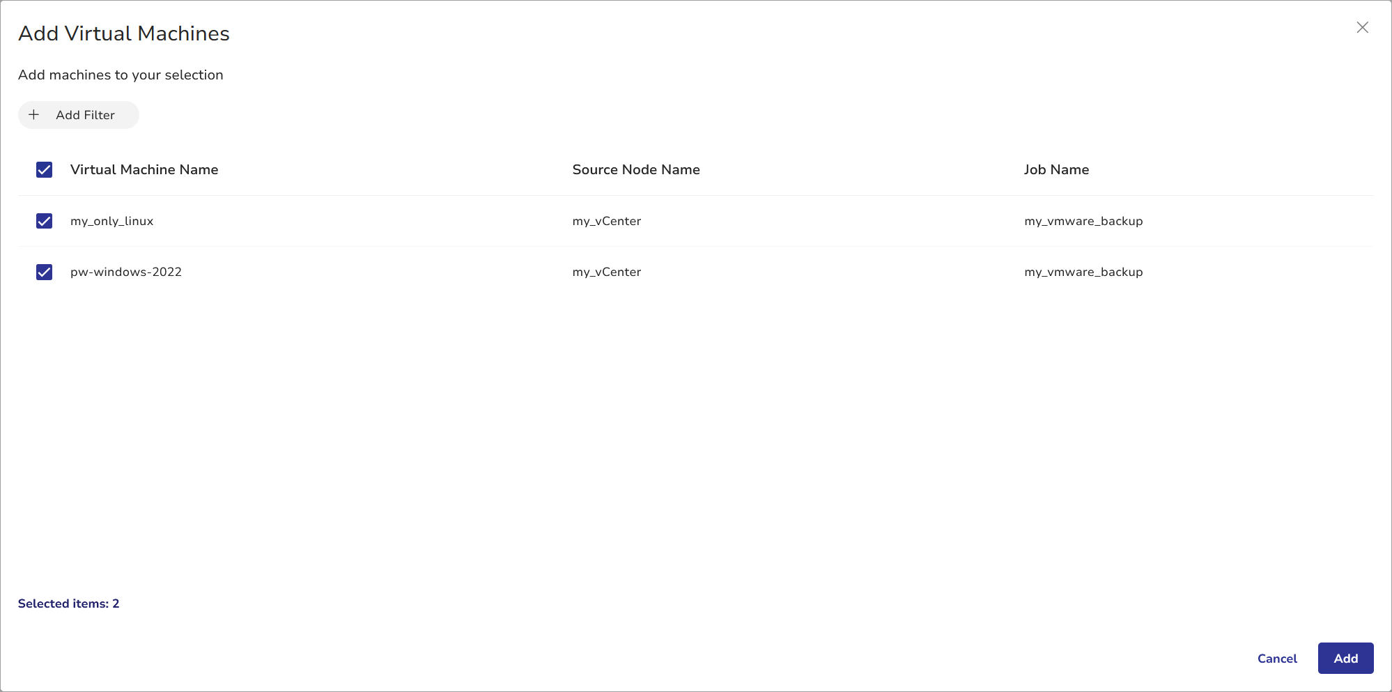 - Select Multi-VM Restore, click Next, then click Add virtual machines.