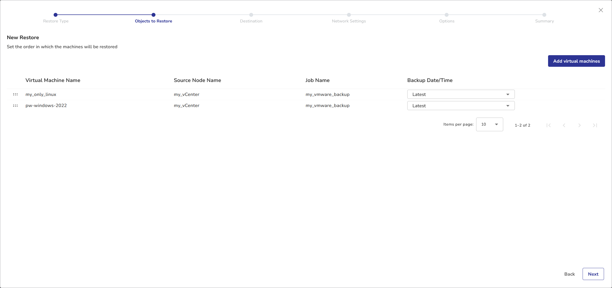 This restore mode orchestrates the restore process of multiple virtual machines from the VMware environment in a single restore job. You can select virtual machines backed up in different VMware backup jobs, choose the order in which the VMs will be restored and restore them to a new data store.