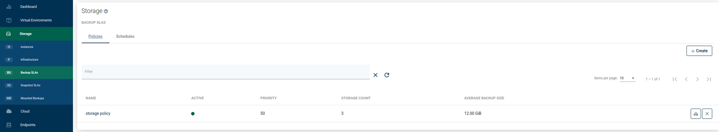 To create a new backup policy, open the Backup SLAs tab under the Storage Provider section and click on the Create button on the right.