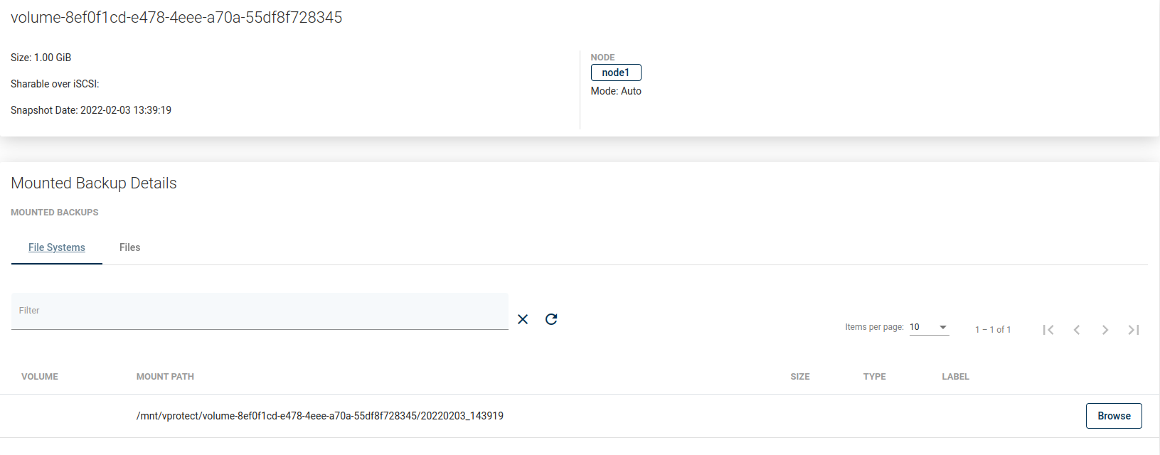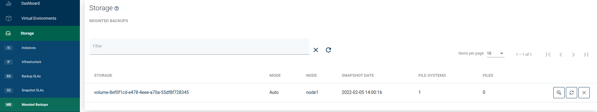 Storage- mounted instance nameMODE- Auto - vPlus auto-detects filesystems and mounts them on the path "/mnt/vprotect/". In Manual mode, the user chooses the mount point for selected filesystems.NODE- the vPlus node is responsible for the mounting job.SNAPSHOT DATE- the date when the backup was created.FILE SYSTEMS- the number of mounted filesystems.FILES- the number of mounted virtual disk images.