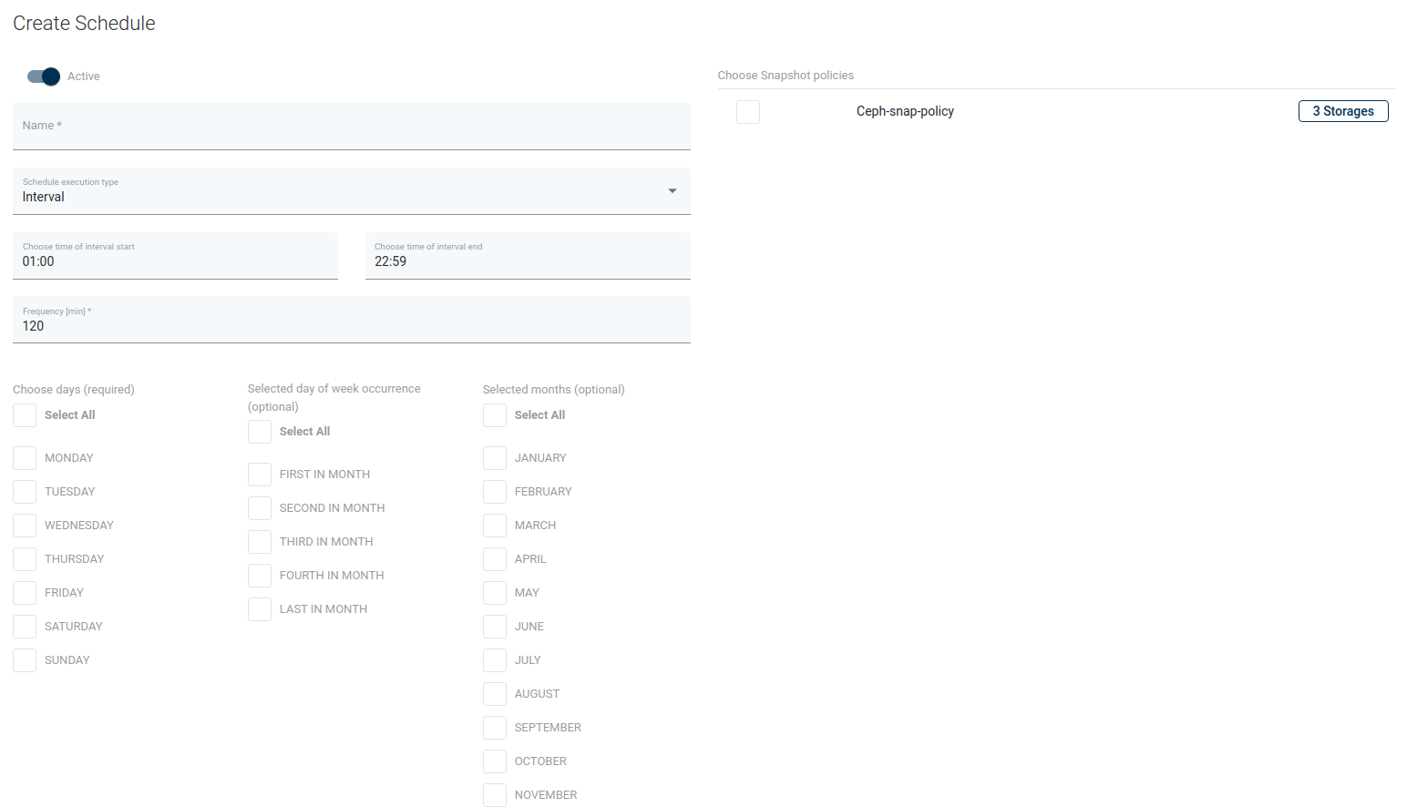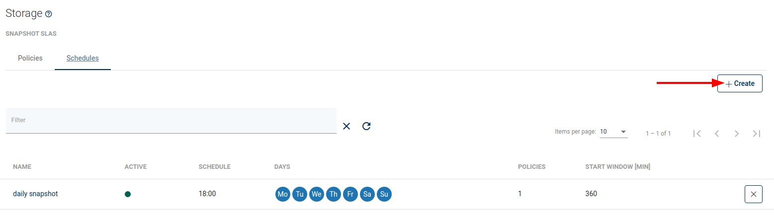 The Schedule defines when and on which days snapshots should be created. To define a new schedule, click Create Schedule button.