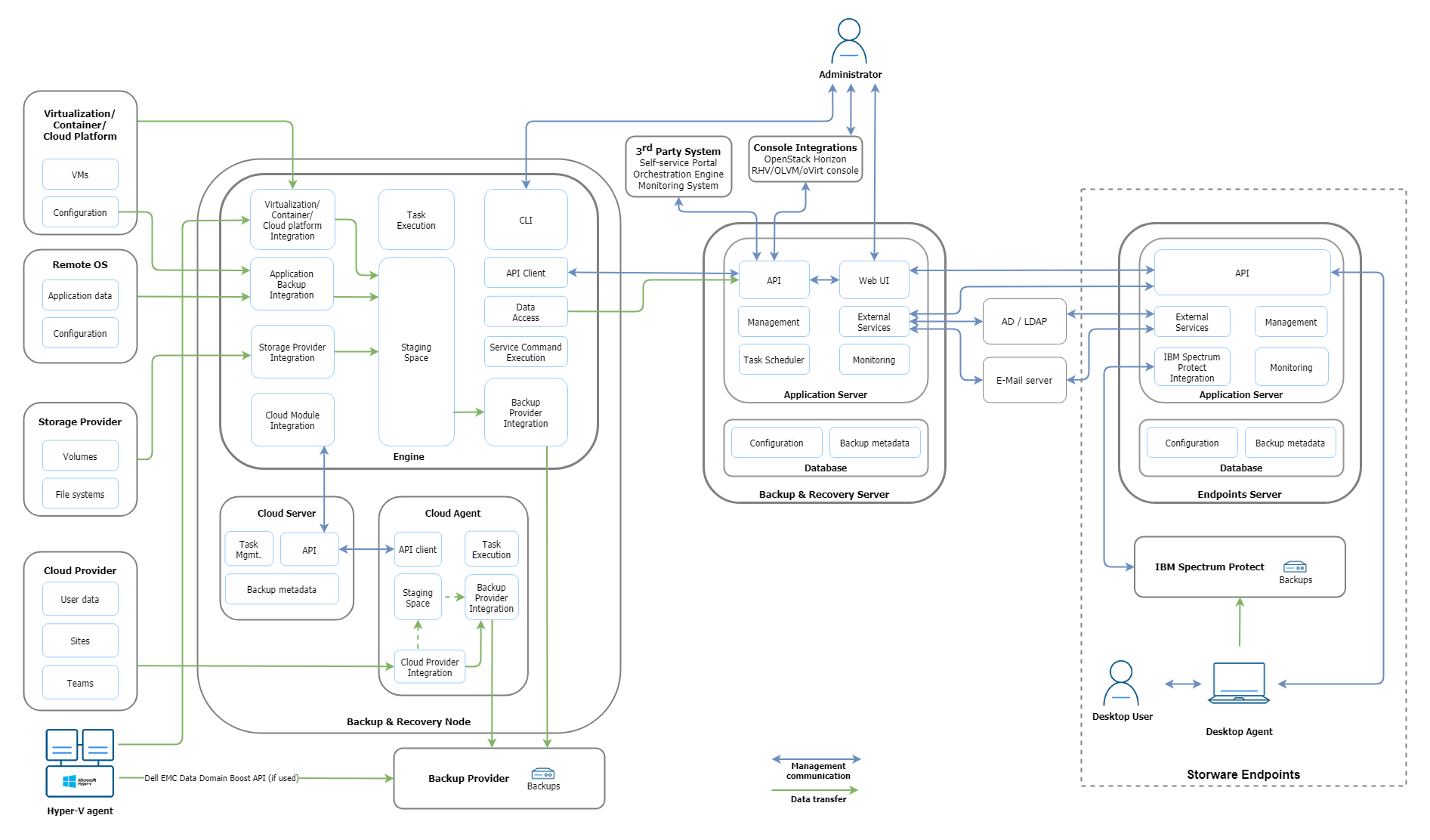 The architecture below shows key components, communication, and data flows. All communication between 3rd party systems goes via RESTful API exposed by vPlus Server. Tasks are being performed by the Node behind the scenes. End-user is going to use only a 3rd party system to invoke and monitor the status of the tasks.