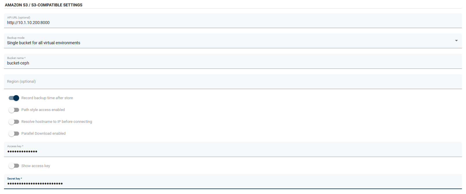 By default, Ceph provides S3 via port 8000. Also, remember to enable the "record backup time after store" option.