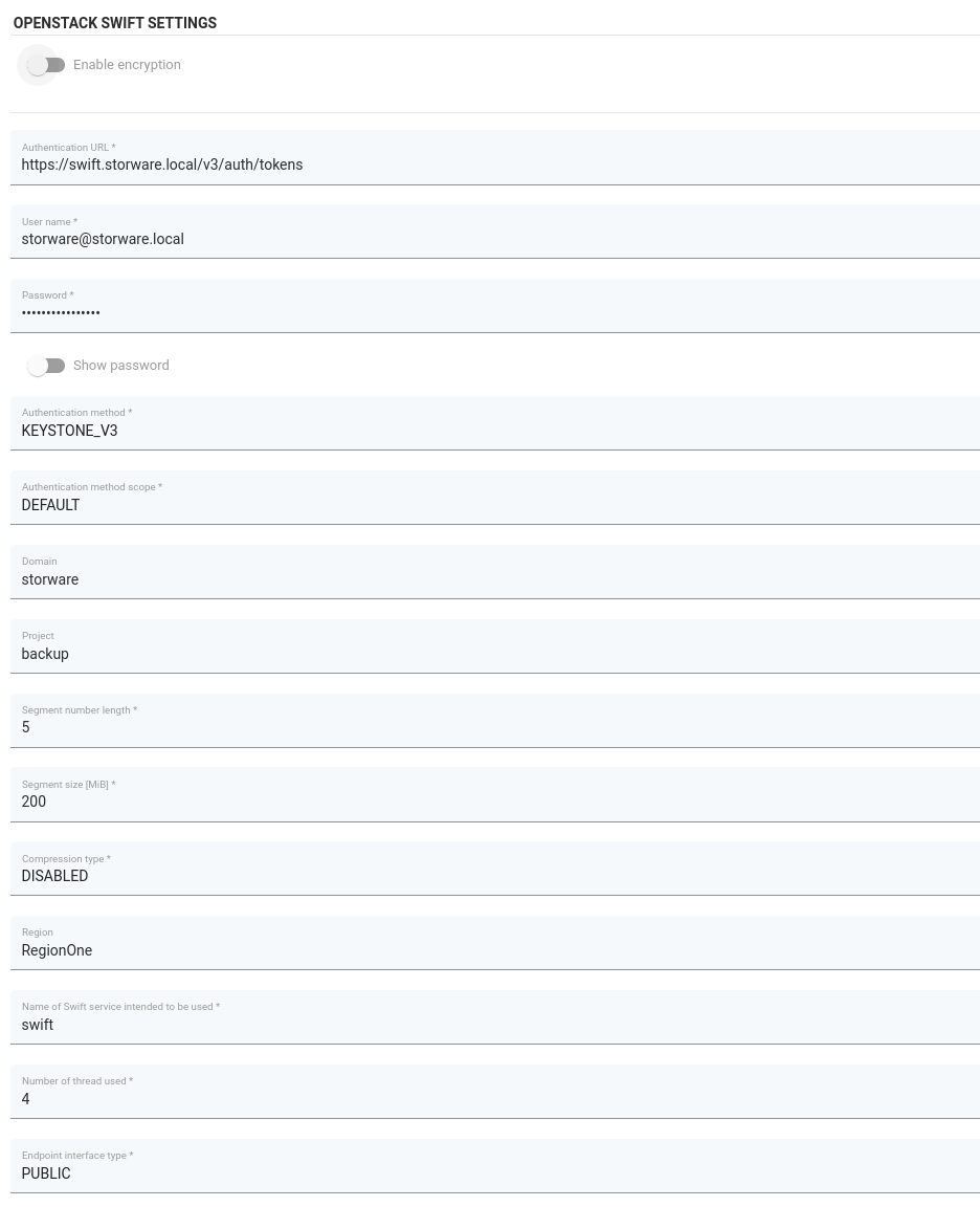 Next, provide settings specific to OpenStack Swift: