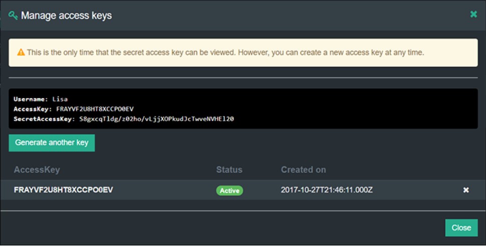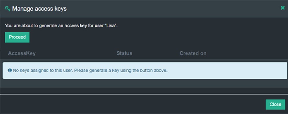 Click on Proceed to generate the user's AccessKey and SecretAccessKey.
