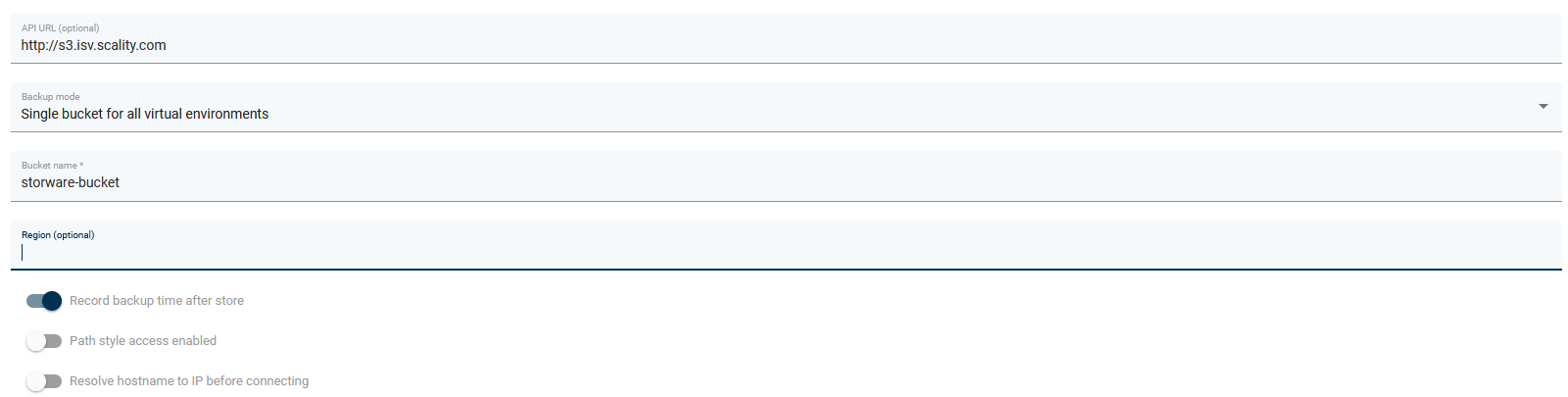 Like in other S3-compatible backup destinations, you have to fill in the fields below and provide the access and secret key.