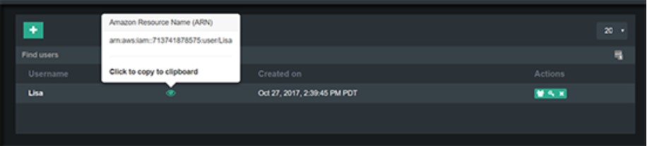 The user management panel displays the user name and the Amazon Resource Name (ARN). Now we will generate the access and secret keys for the user. Click on the key icon in the Actions column of the user row.