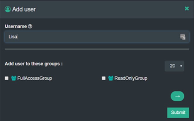 Log in as an account user using the password set in Setting an account Password from the S3 console GUI. Select the user to open the user management window. Click Add user to open the add user window. Enter the user name and make sure to check the box for FullAccessGroup.