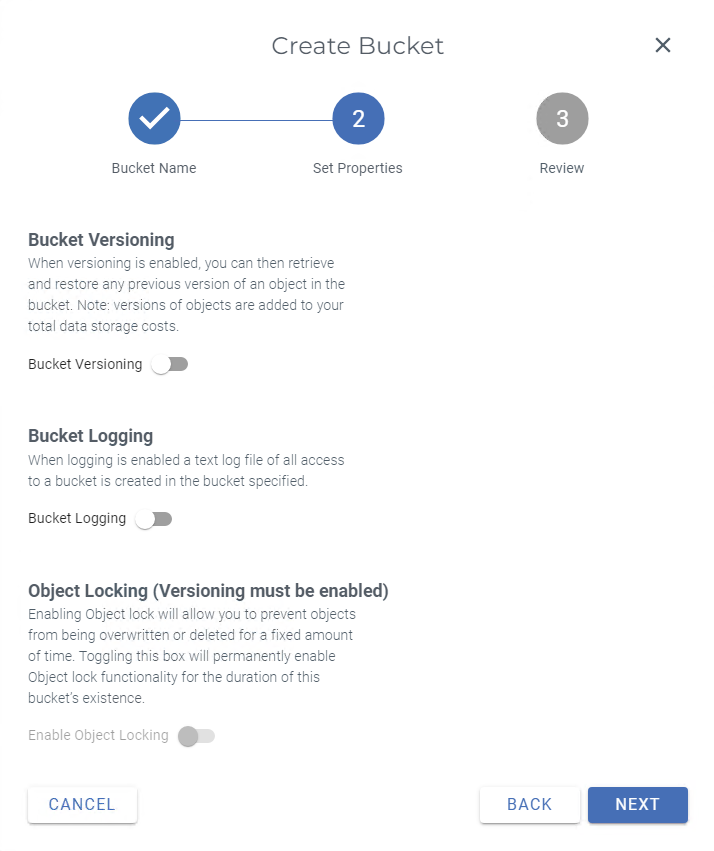On the second tab, you can choose versioning within the bucket, login, and protect your bucket with object locking (a function used to protect against ransom attacks)