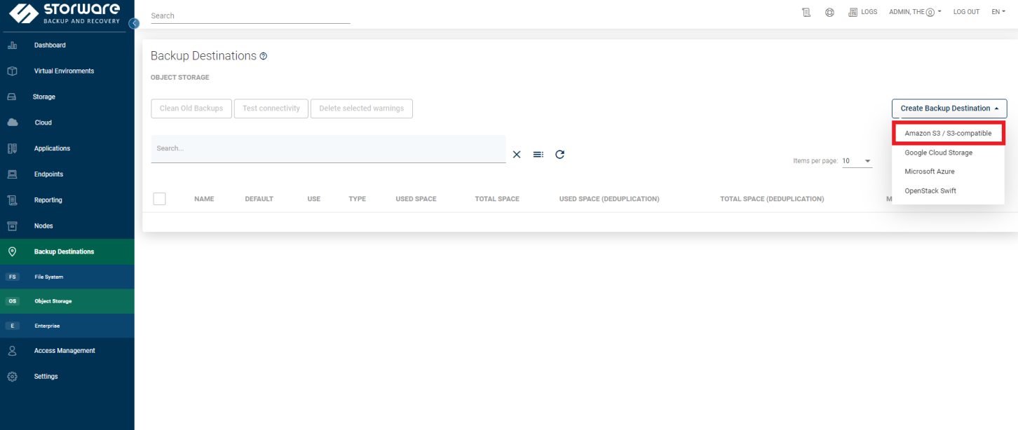 5. Go into Backup destination -> Object Storage -> Create Backup Destination - Amazon S3 / S3-compatible.