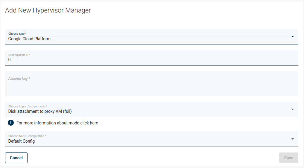 You add GCP as a Hypervisor Manager. You need to provide the organization ID and service account keys of a user that has required permissions.