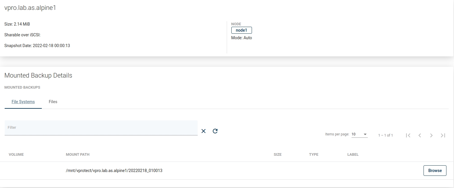 The Mounted Backups tab show mounted Virtual Machine backups on the vPlus node.