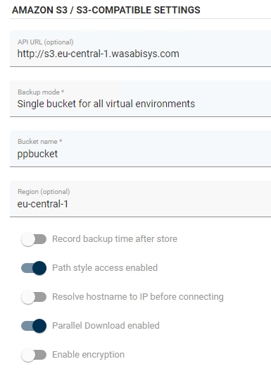 Wasabi is an S3-compatible backup provider. Configuration as the backup destination is similar to AWS S3.