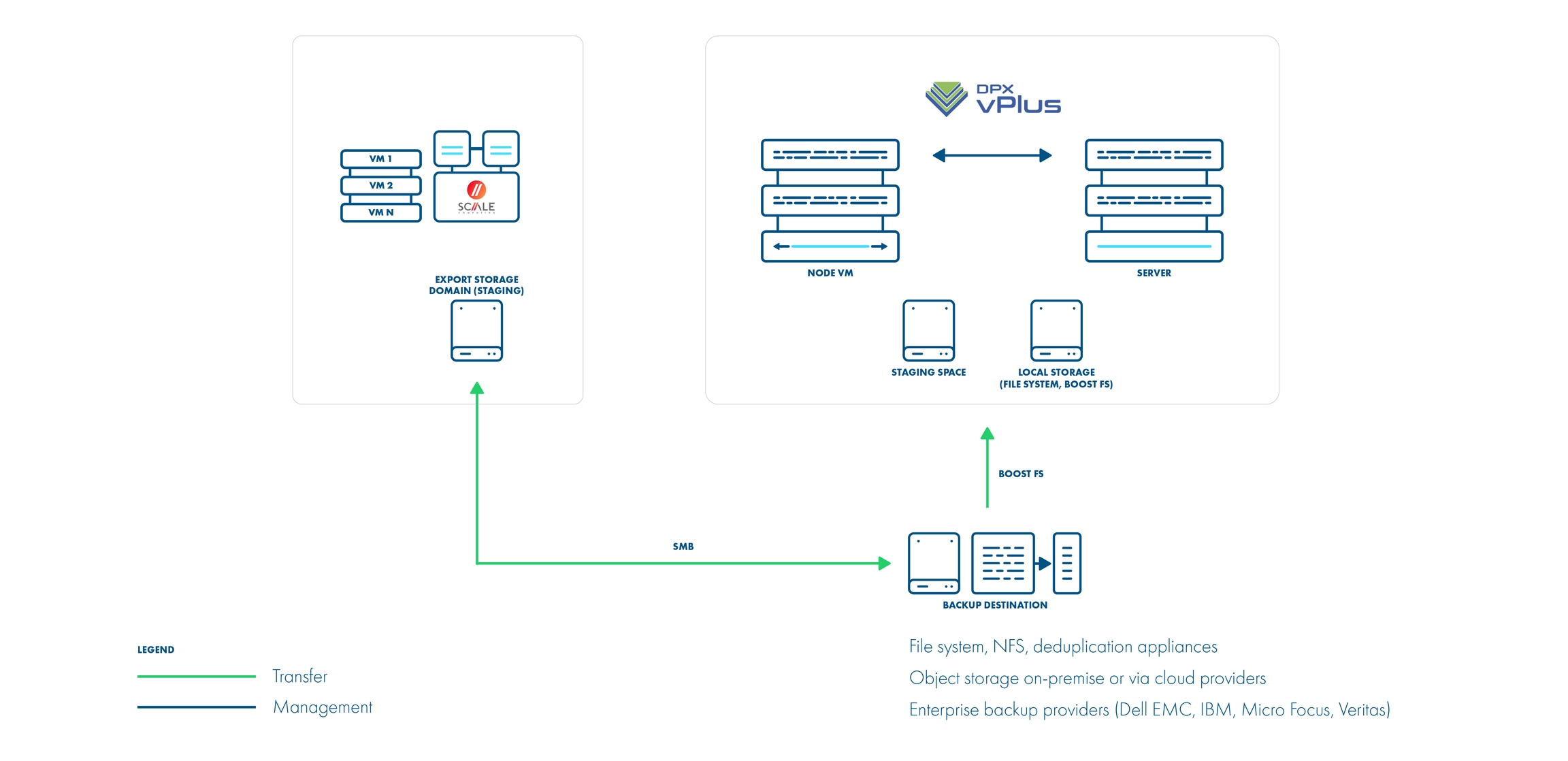 Export storage domain strategy performs the export using a Samba server running on a node machine. This strategy does not require a proxy VM.