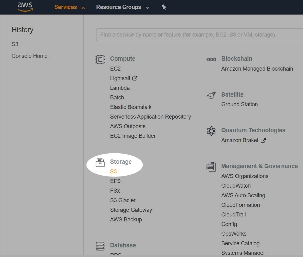 After logging in, expand the services tab and choose S3 under the Storage section:
