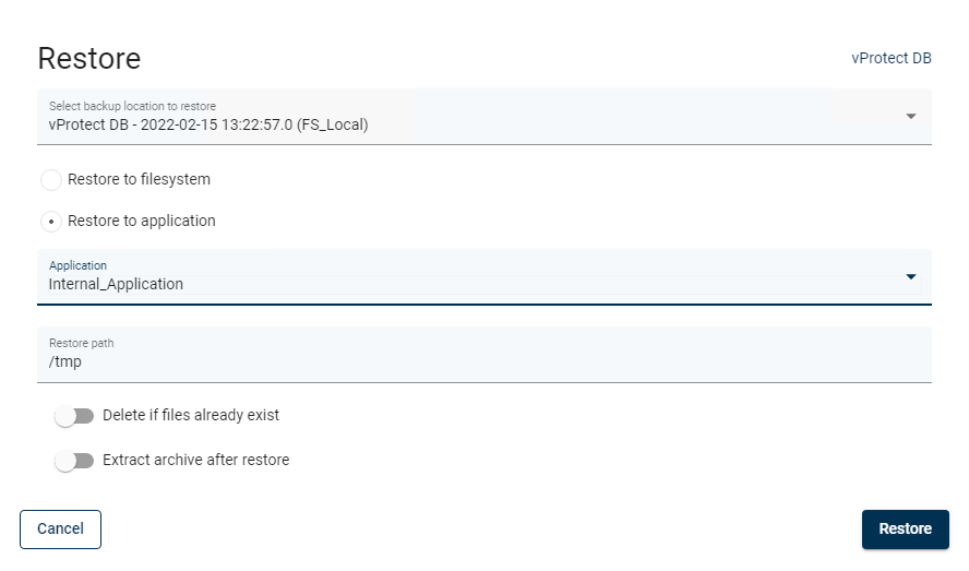 The "Restore to application" option differs in that it allows you to restore files to the server where the application is located.**