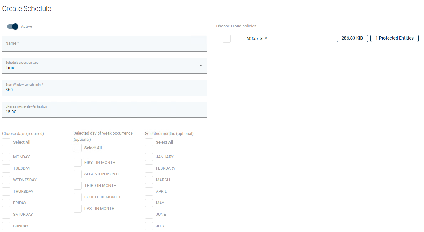 A schedule defines when and on which days cloud instances should be backup. To define a new schedule, open Backup SLAs under the Cloud section and go to the Schedules tab, then use the button.