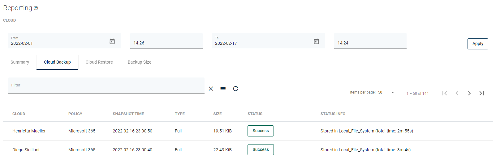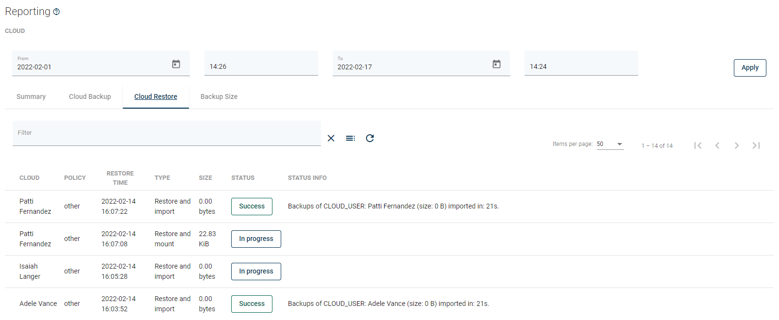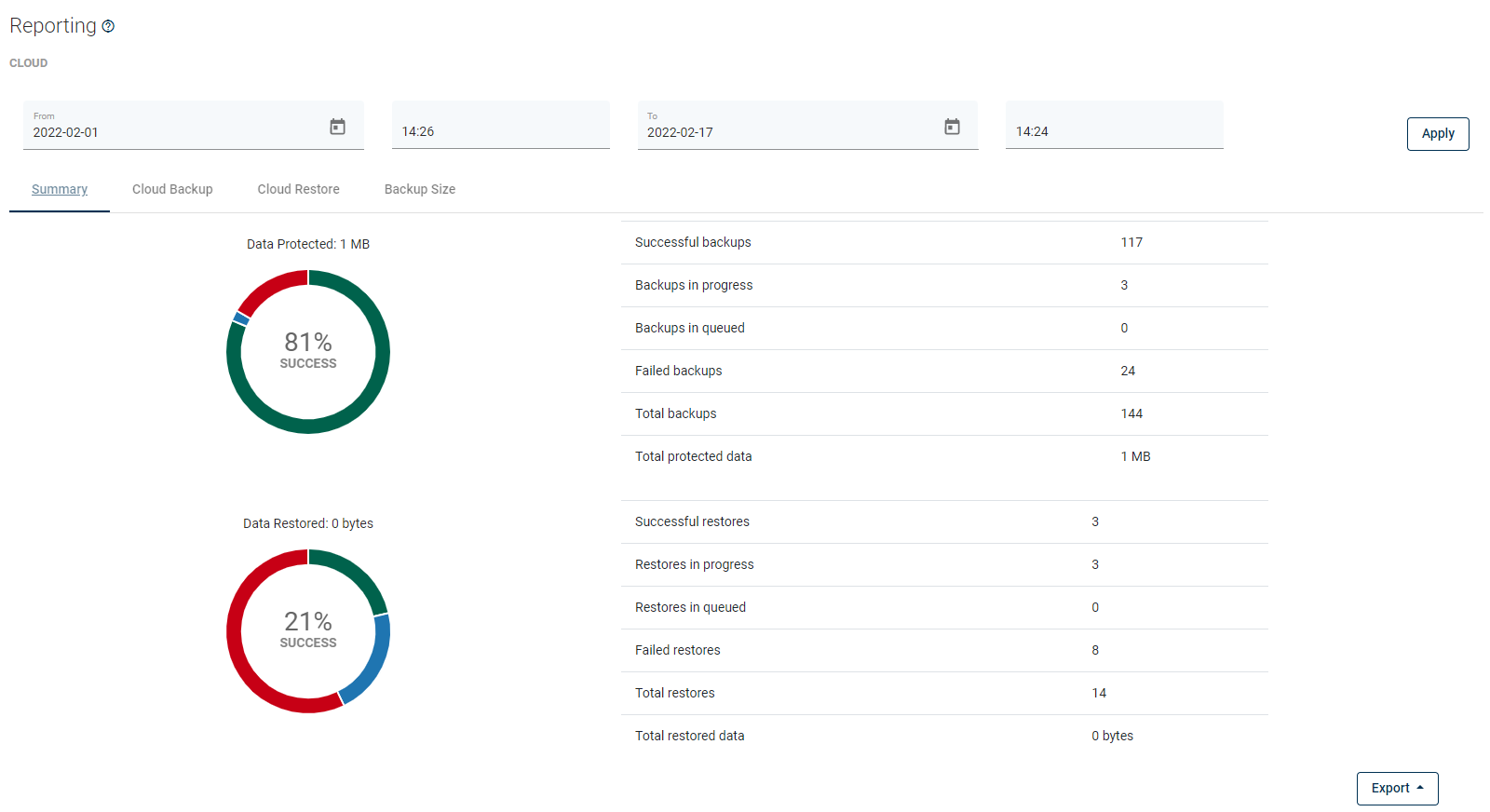 From here, you can set a date range or go to a detailed summary of backup, restore jobs, and backup size.