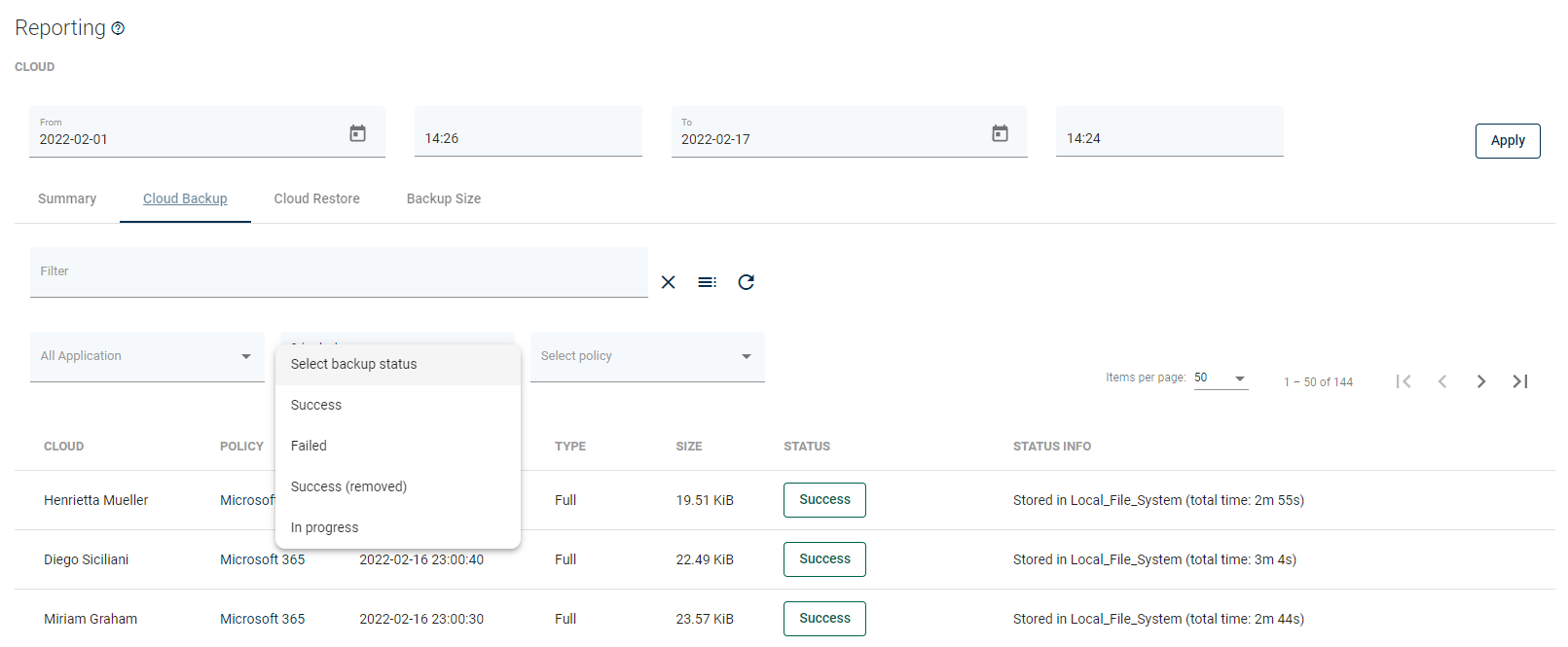 The functionality is the same as for the backup statistics, you can see all the tasks completed within the set deadline or filter them by status, policy, or instance.
