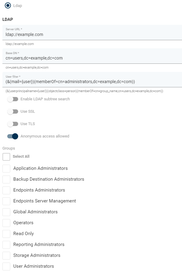 Enable LDAP subtree search- when disabled, only 1 level below base DN is being searchedUse SSL- enables SSL for LDAP connection ('ldaps://')Use TLS- enables TLS for LDAP connectionAnonymous access allowed- if users are not allowed to anonymously browse LDAP directory, you need to provide an account that has that privilege:Service account DN- DN of the userService account password- password of that user