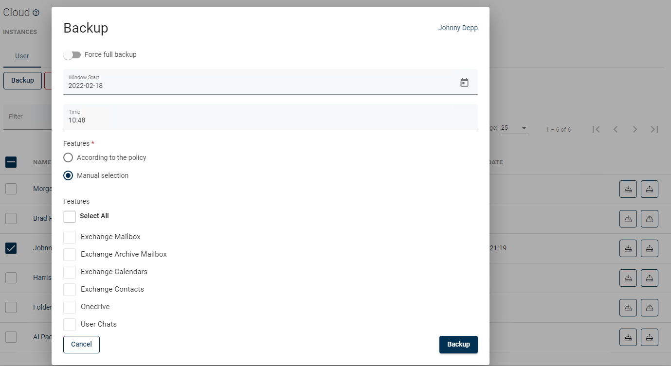 In the next window, choose backup type and what features you want to protect. If you want a backup of just one or more features, use manual selection or use according to the policy to back up all features selected in Backup SLA then click Backup button.