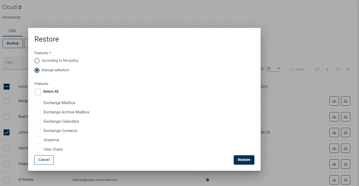 In the next window, choose if you want to restore according to the policy or use manual selection to restore one specific feature directly to the restored account and click Restore the button.
