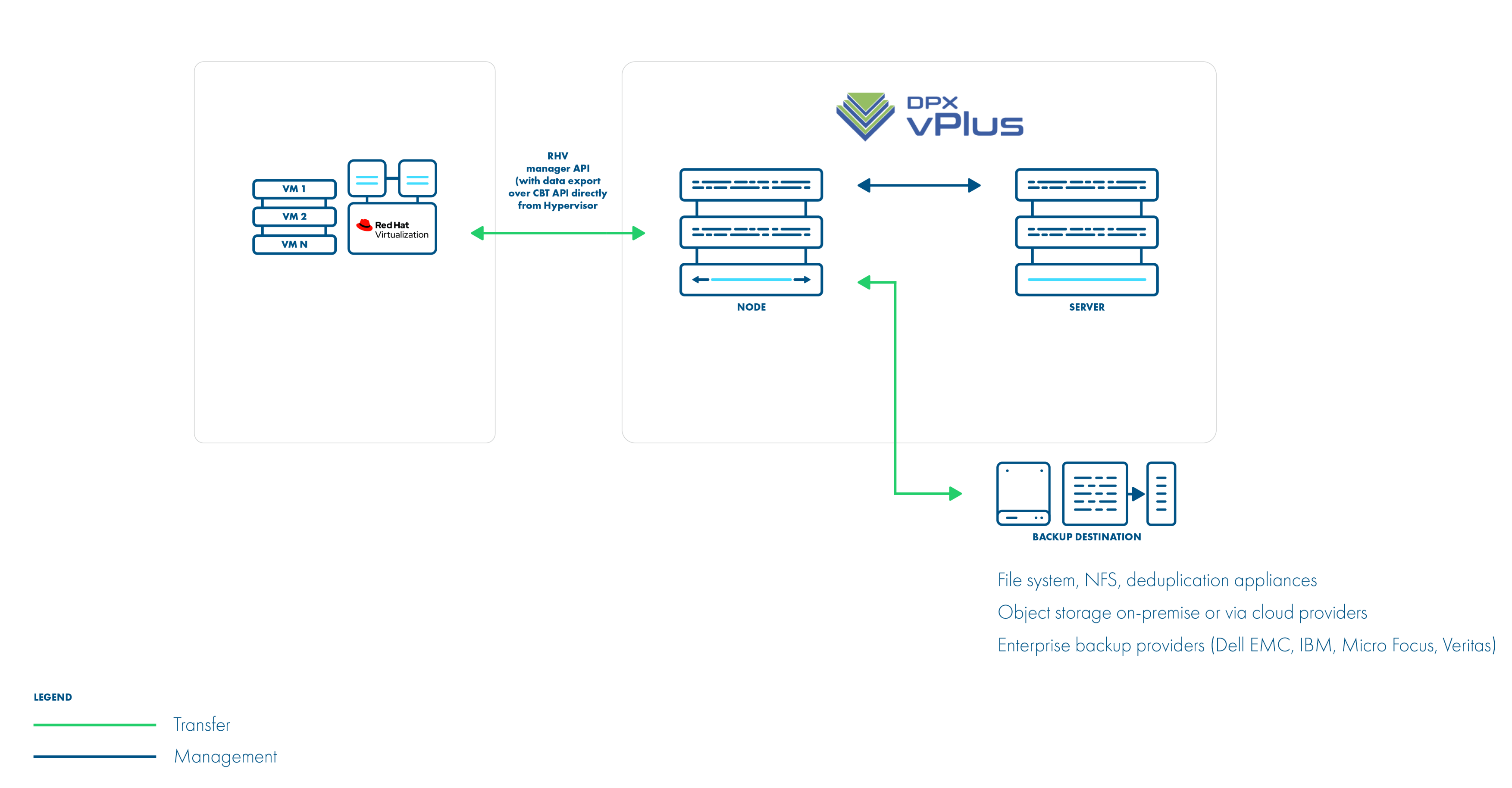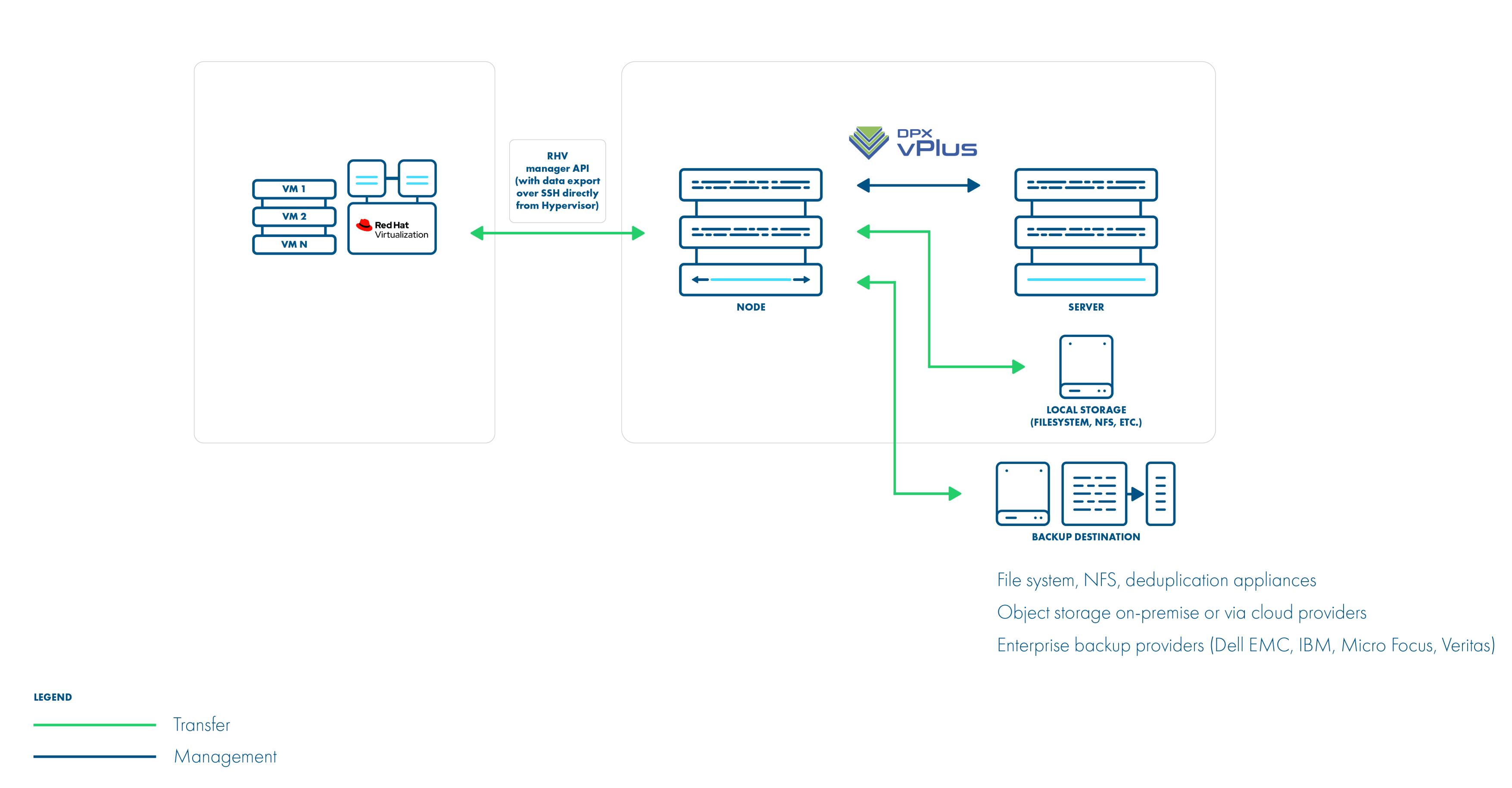 This strategy supports incremental backups. Assuming you have RHV 4.2 or newer – just add your manager to vPlus and setup is done. From a network perspective, it requires two additional ports to be open - 54322 and 54323 - and your data to be pulled from the hypervisor manager.