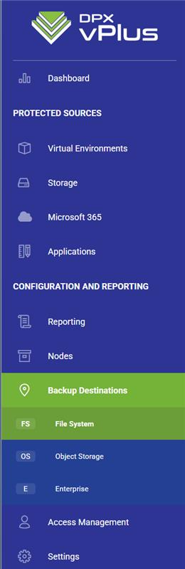 A backup destination is a storage location where DPX vPlus keeps VMs, Containers, Cloud, and applications backup copies. To configure a backup destination, you can use the following storage types:
