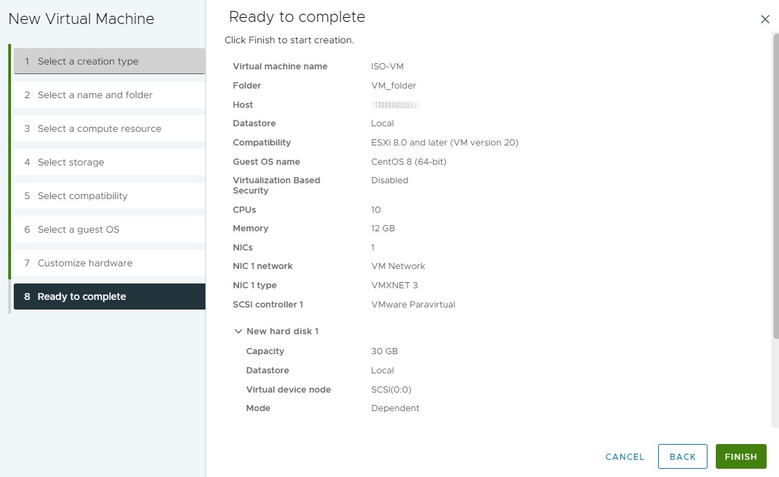 Review the configuration summary and click "Finish" to create the virtual machine.