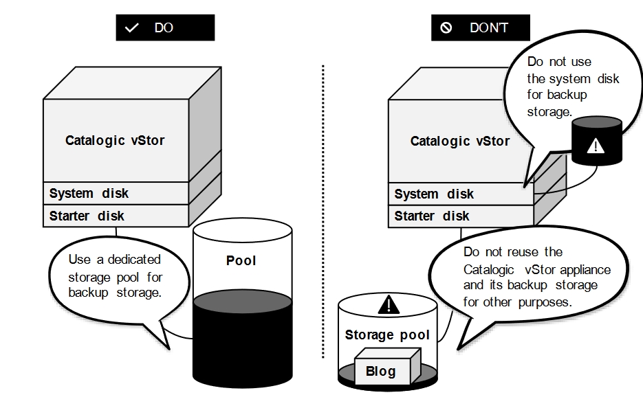 Never create a backup storage pool on the System Disk of the Catalogic vStor appliance.