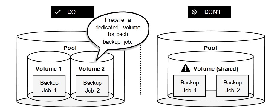 Use one volume for one backup job to avoid complexity and potential issues.