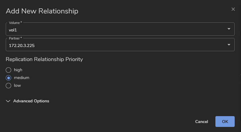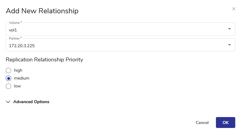 Creating a new Replication Relationship using vStor Web Interface