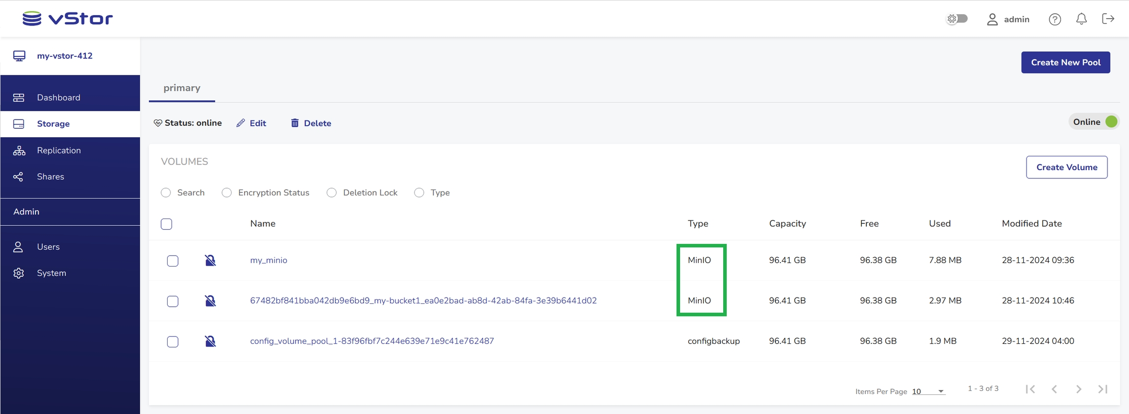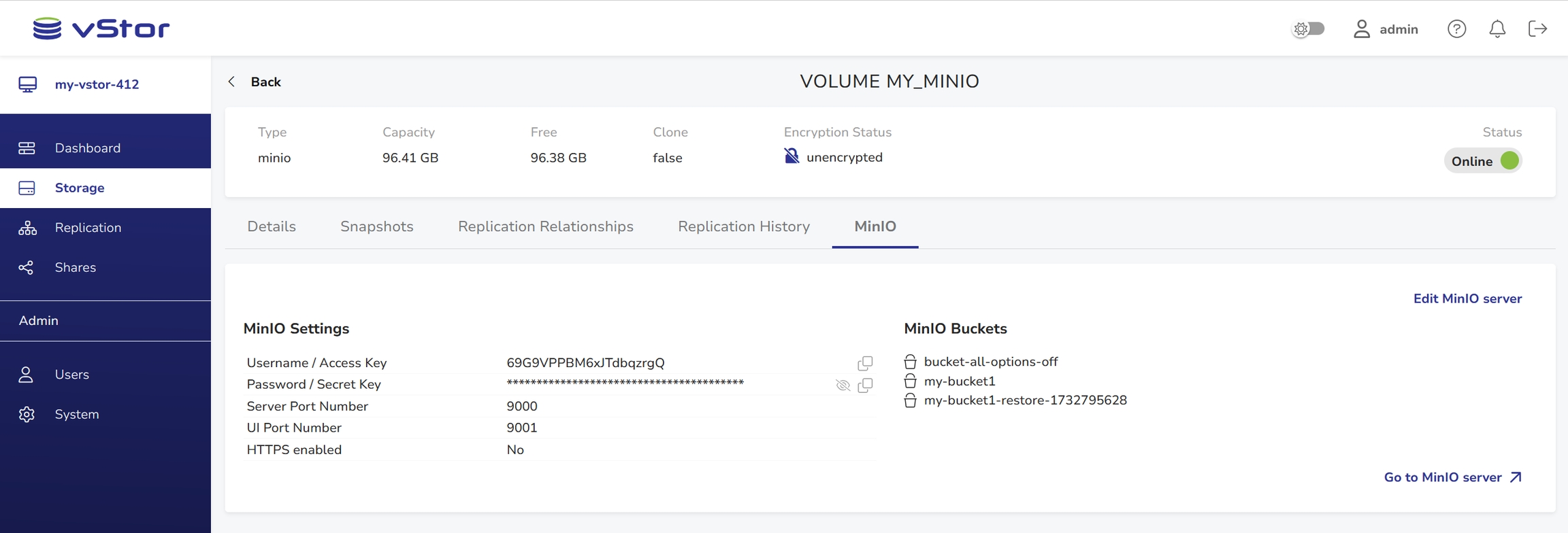 admin.From the navigation menu, select Storage and open a MinIO volume.\