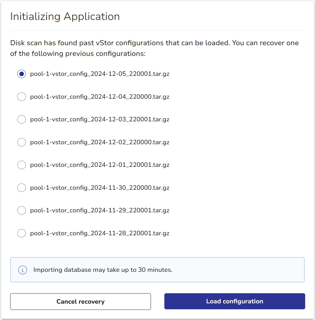 vstor system loadconfig --path /opt/vstor/backup/vstor_config_<date_and_time>.tar.gz