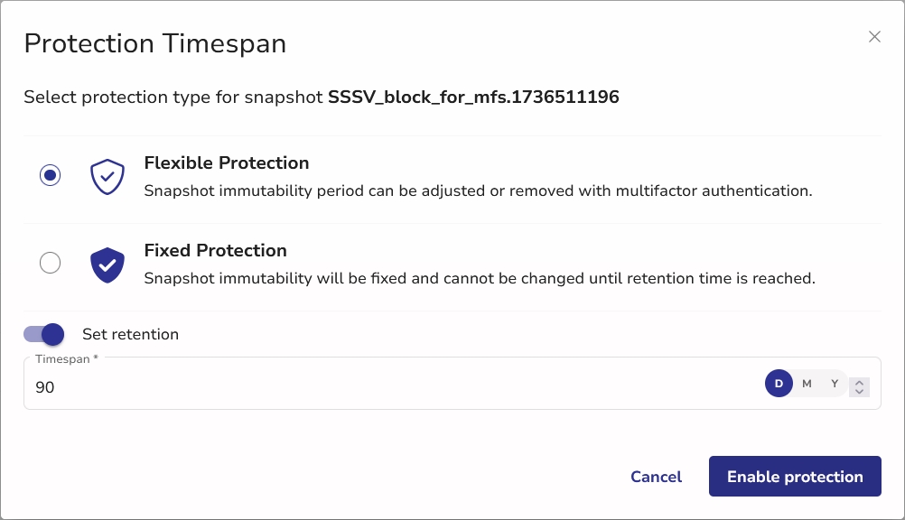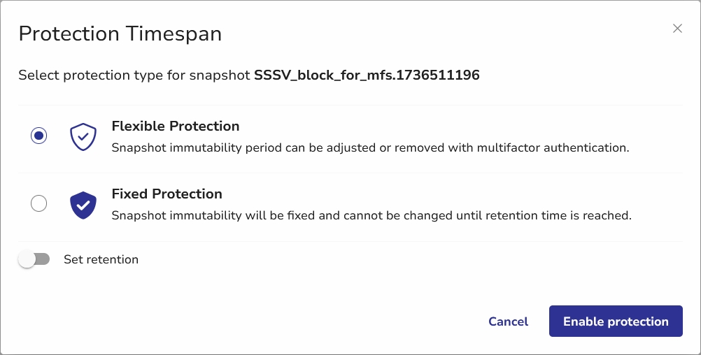 A retention period must be set when applying a Fixed Protection, defining the duration for which the snapshot will remain immutable.