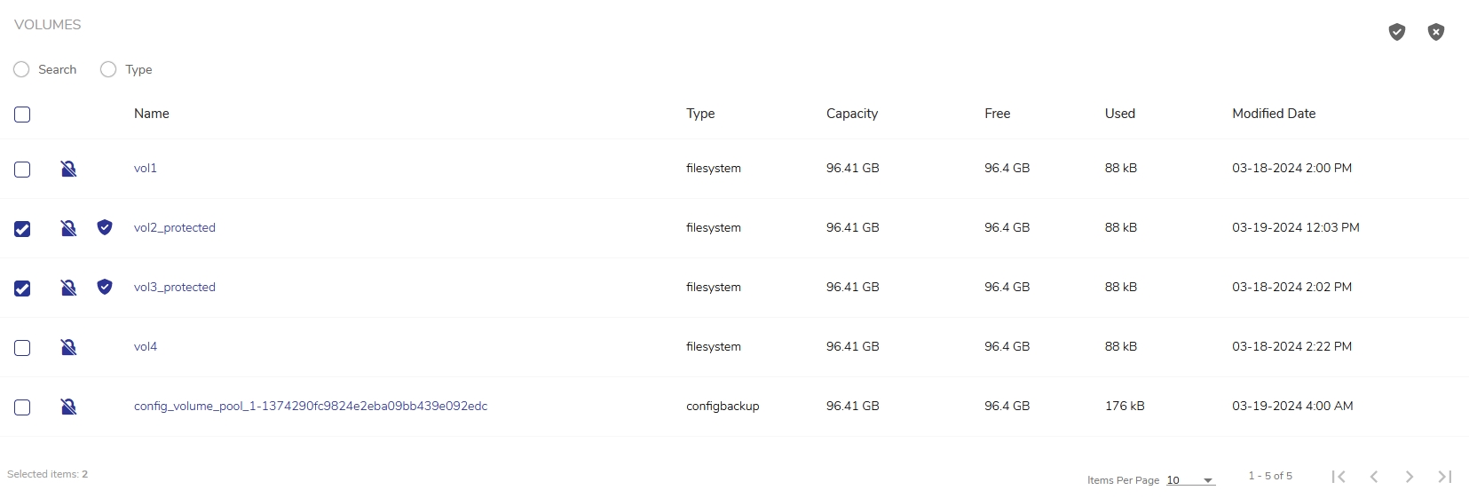 Protected volumes are marked with a shield icon in the volume view, indicating their protected status.