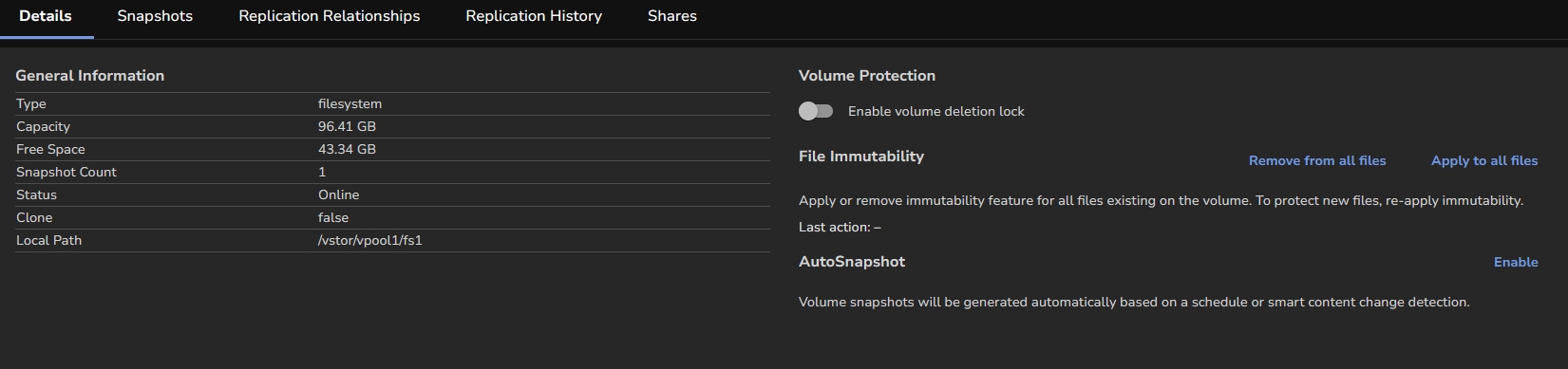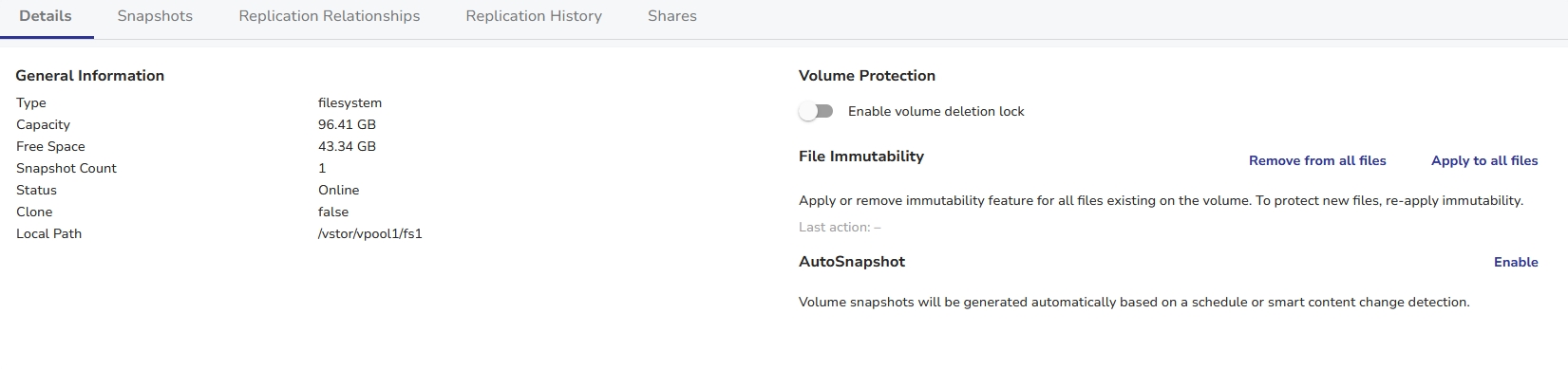 Immutability in vStor provides a robust mechanism to protect data at both the snapshot and volume levels, ensuring data integrity by preventing unauthorized or accidental modifications and deletions. This feature allows administrators to set holds on snapshots and enable protection on volumes, safeguarding critical data against ransomware attacks and other security threats.