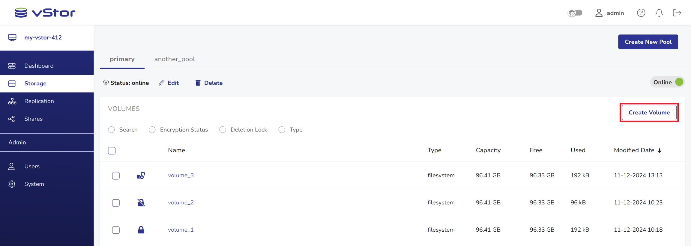 Click OK to add the volume. For Filesystem volumes, set up a share as needed. For details, see Managing Shares.