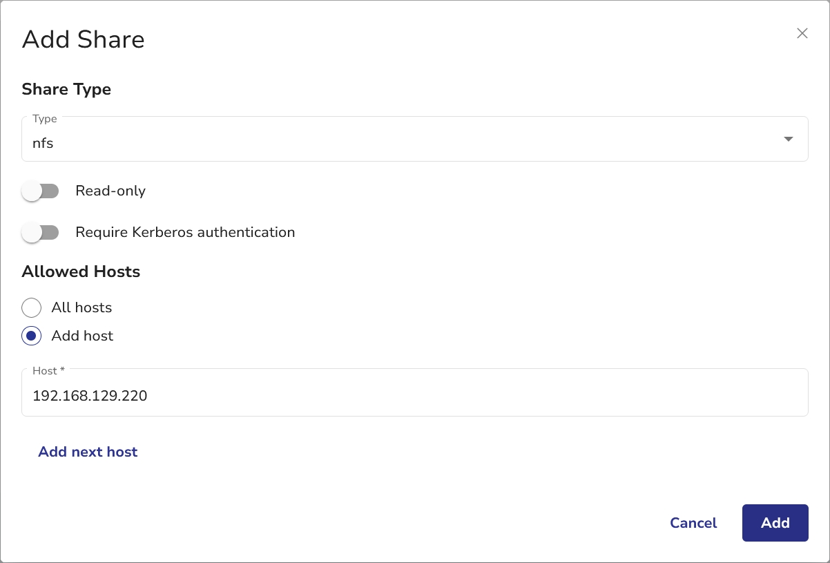 Click Add to add the share. A connection check will be performed on each host. An error will be thrown for each unreachable host. You cannot add a share with one or more unreachable hosts.