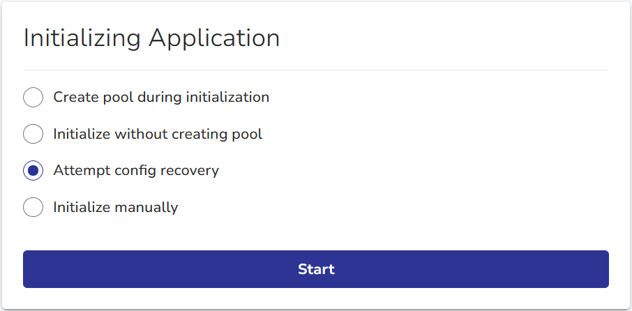 Attempt config recoveryat the prompt.\![[image expected here]](/assets/images/deploy_fresh_vstor-initializing_application-0d25aad5d64fe9e28b3de5527a75d488.png)