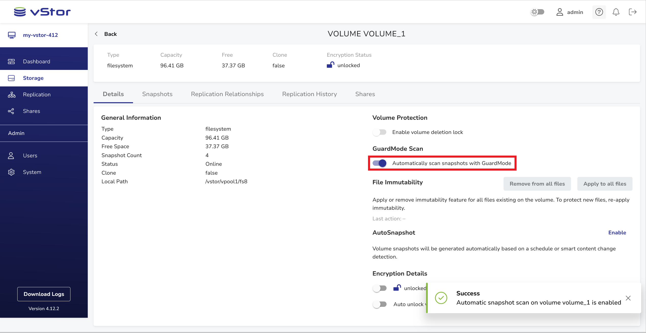 The automated GuardMode scan feature is controlled at the volume level. It can be enabled or disabled by the admin user and any standard user with pool-wide privileges. When enabled, all newly created filesystem snapshots on the volume will be scanned automatically when detected.