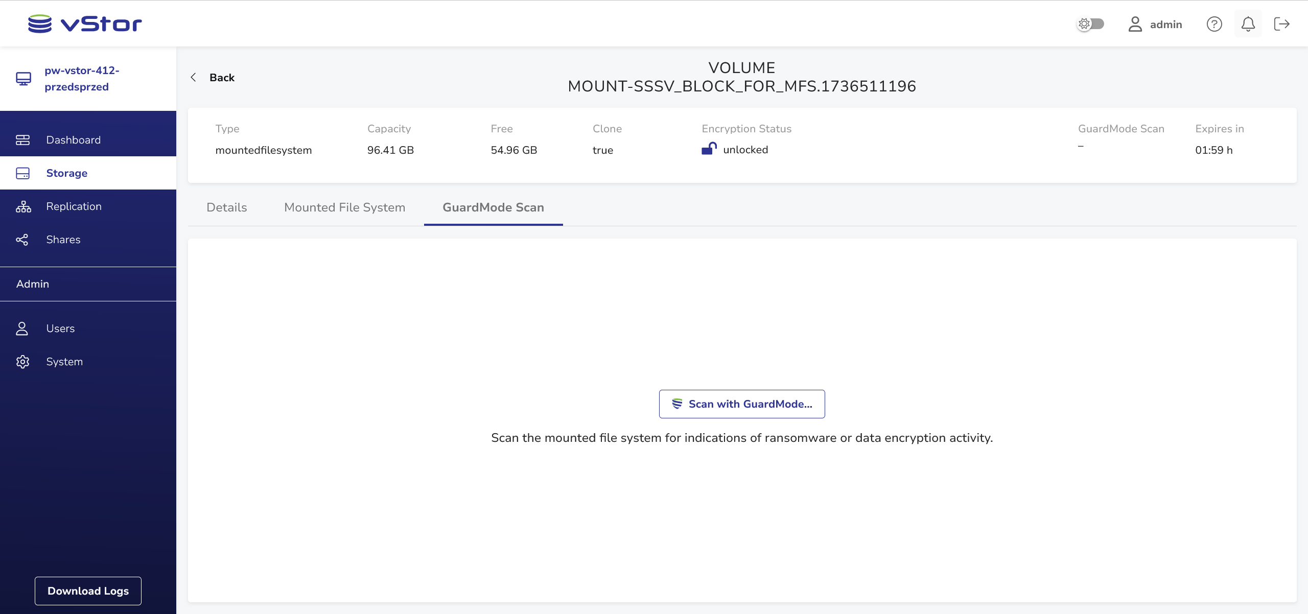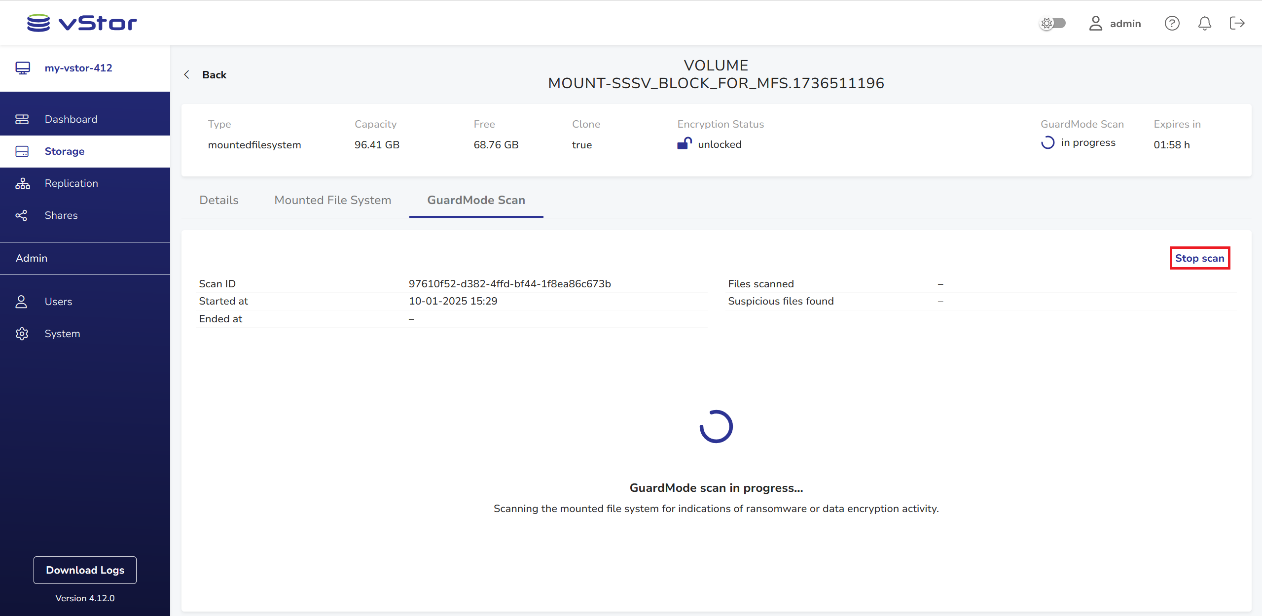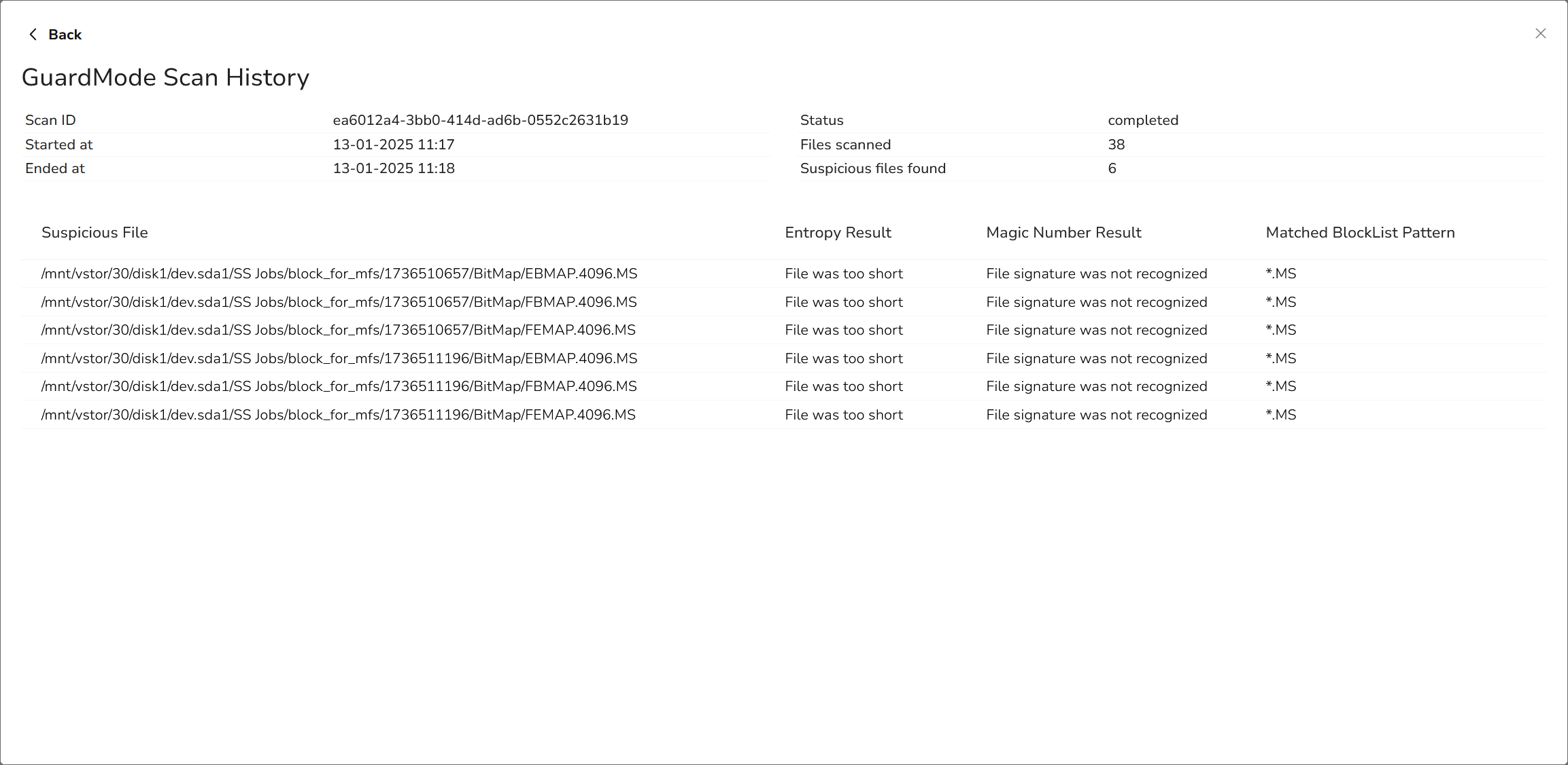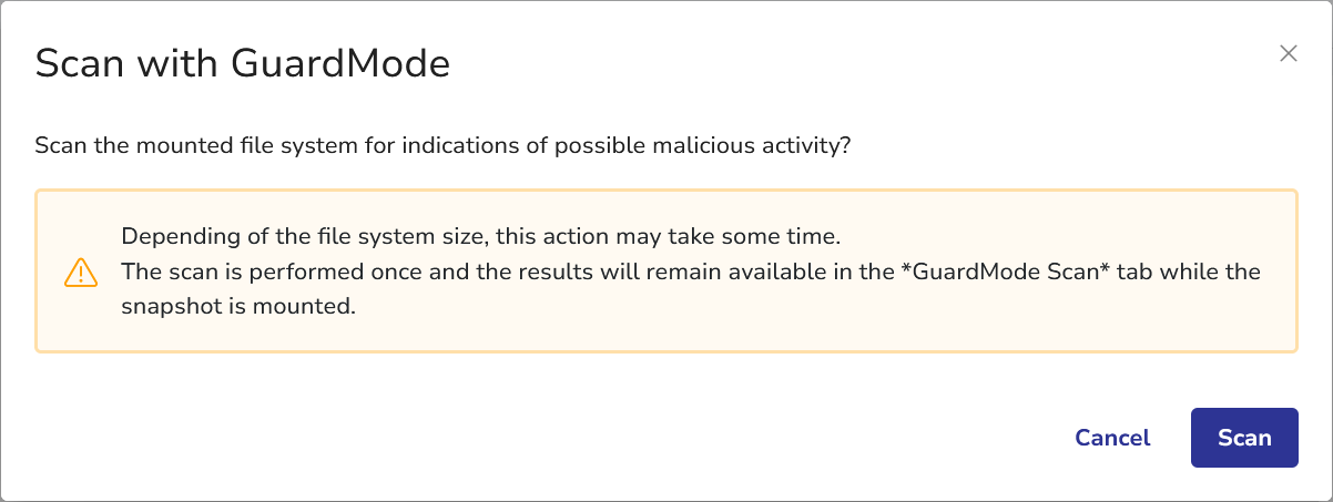 GuardMode Scan is a powerful feature that allows you to scan mounted filesystems for potential ransomware infections or data encryption. This tool is particularly useful when you want to ensure the integrity of your data before restoring it to production environments.
