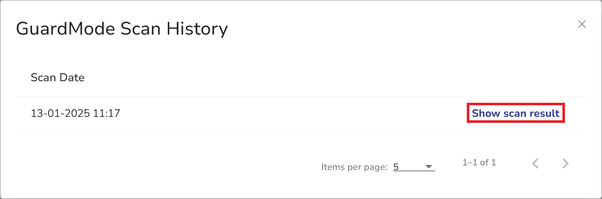 1. The GuardMode Scan History dialog shows scan dates for all GuardMode scans performed on the selected snapshot. To see more details, click the Show scan result button.