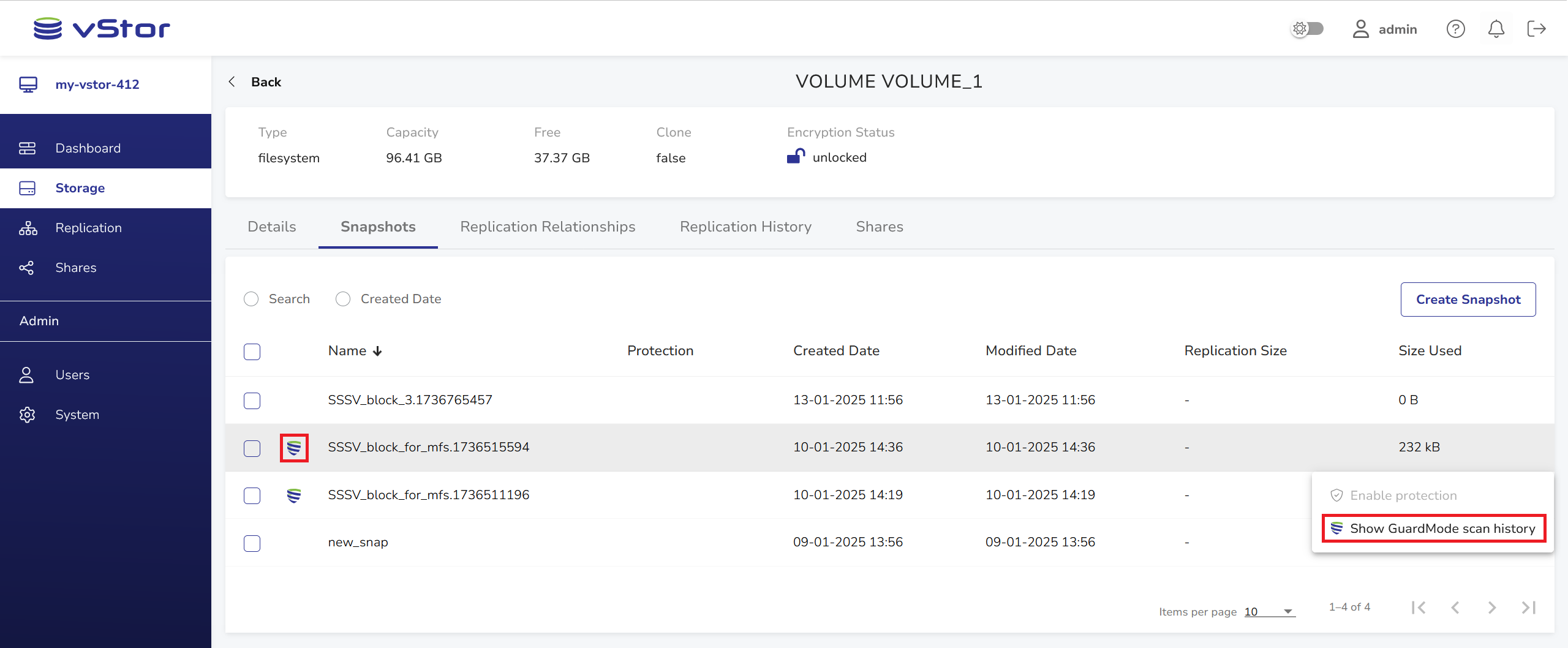 1. View the detailed GuardMode scan history for the selected snapshot.