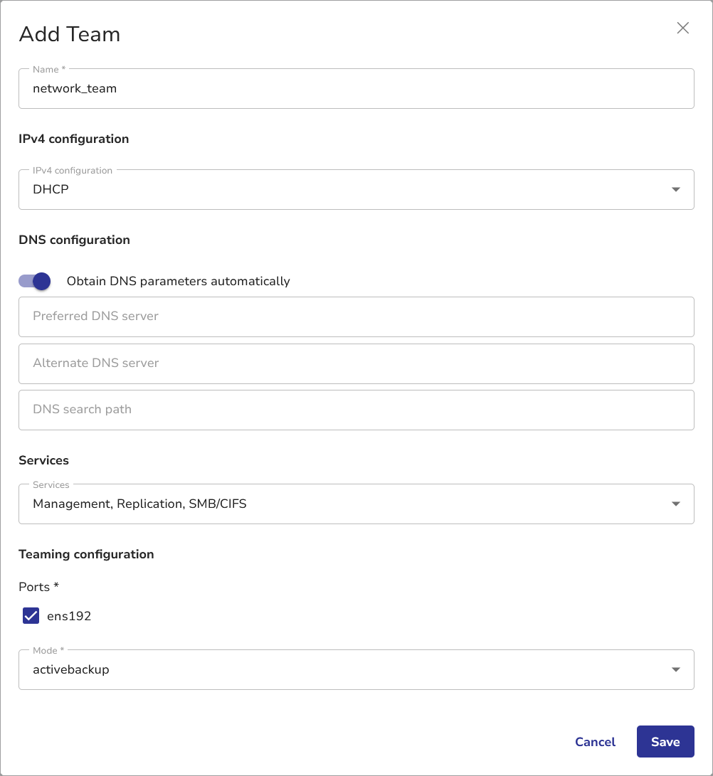 - Ports β Select one or more physical interfaces to include in the team. Once assigned to a team, an interface cannot be used for other teams.