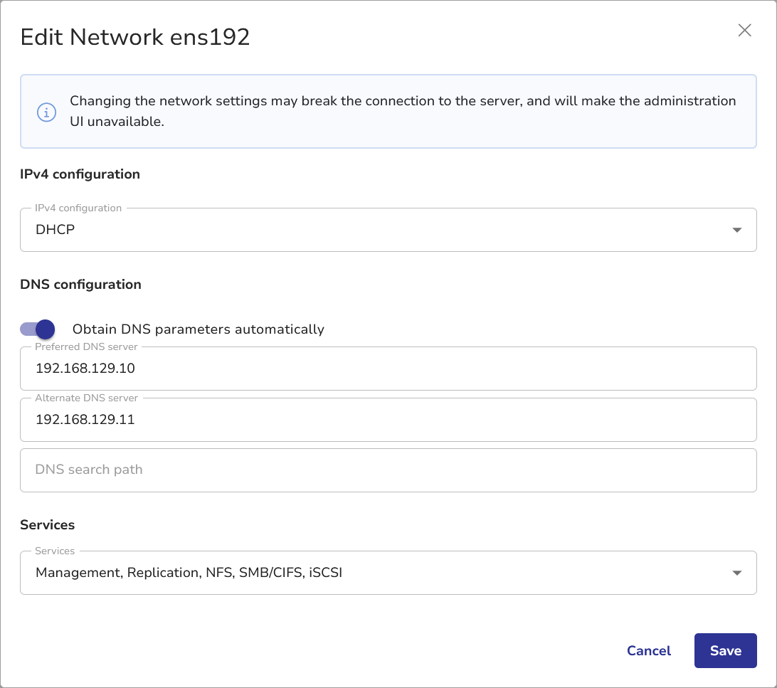 Run the vStor network update command to modify services associated with an interface, for example, if youβre using a dedicated interface for data traffic to improve performance: