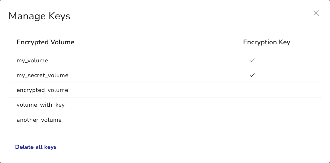 The Manage Keys dialog window shows the list of all encrypted volumes on the vStor. Volumes with encryption key added to the Encryption Keystore are marked with .