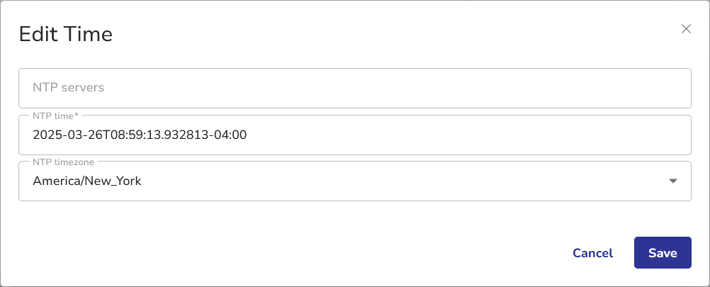 Allows you to manually set the system time. Enter the desired time in ISO 8601 format, which includes the date, time, and timezone offset.