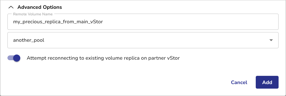 The Advanced Options section allows you to specify a custom name for the volume replica. If no name is specified, the original volume name will be used. You can also select the target pool where the volume replica will be created and stored. If no pool is specified, the first available pool will be used.
