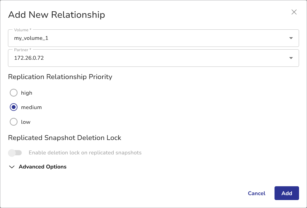 You can also switch on the Enable deletion lock on replicated snapshots toggle for the replicated volumes on the target system. This prevents accidental or unauthorized deletion of replicated data. For details, see Replication Deletion Protection. - Click Add.